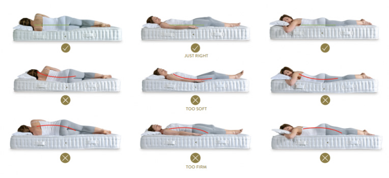 The aim is to keep your spine level, a quick test is to lay on your back, slide your hand into the small of your back, if the mattress is too soft; you’re sinking too far into the mattress thus you’ll struggle to push your hand in, on the flip side if it slides under too easy, it’s probably too firm, a little bit of friction is about right.