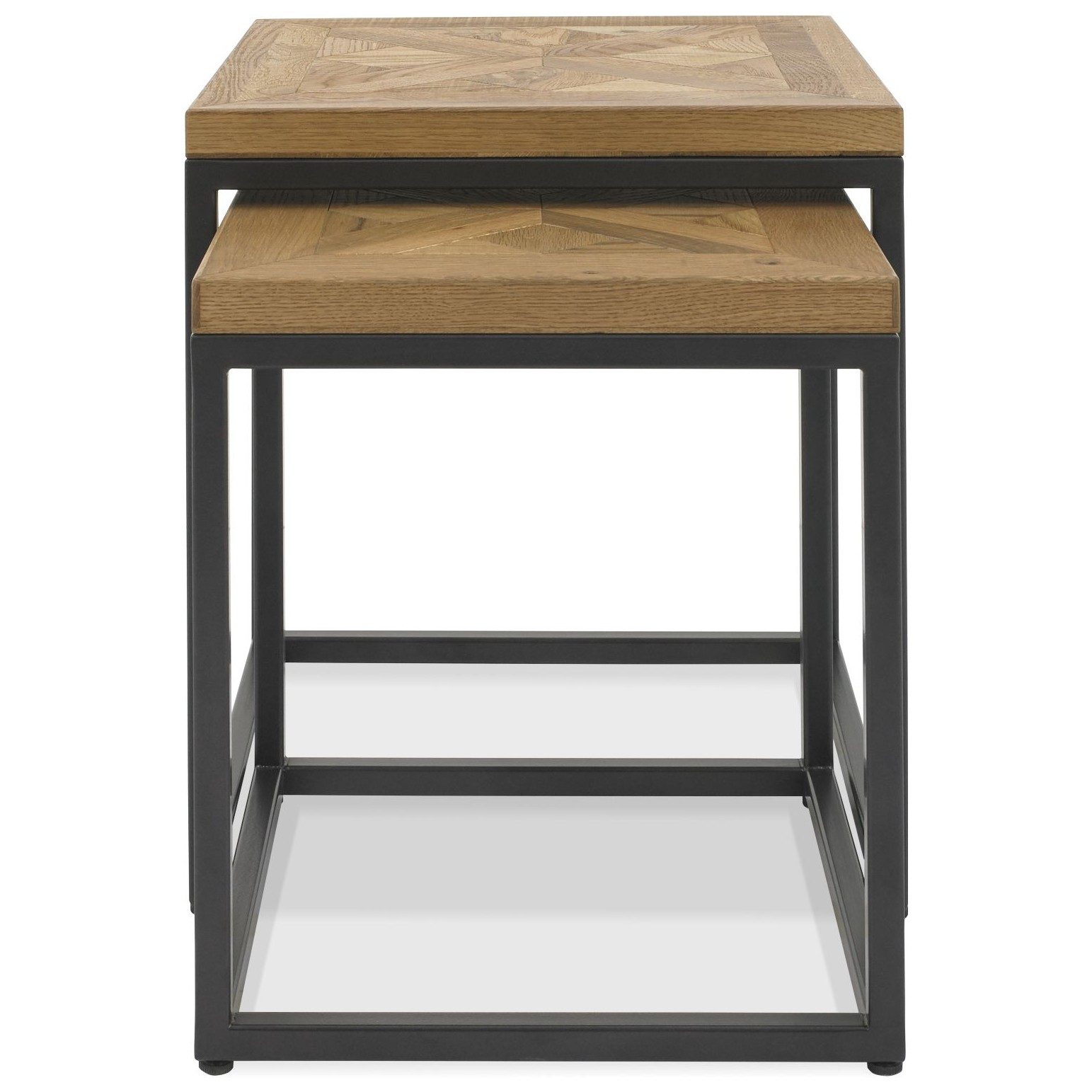 The Indus collection makes a bold statement with its striking design, combining saw-cut oak marquetry tops with a rich 'peppercorn' finished oak veneered frame. Each handcrafted top is wire-brushed and lightly distressed to bring out the natural beauty and varied grain of the oak, creating a rustic character with a wonderfully tactile feel. The unique patterns celebrate traditional craftsmanship while delivering a fresh, contemporary style. Completing the look, each piece is set on a welded black powder-coated metal base, giving the collection an on-trend industrial edge that's perfect for modern living spaces. Robust, stylish, and full of character, Indus is designed to be as durable as it is beautiful, making it the perfect centrepiece for your home.