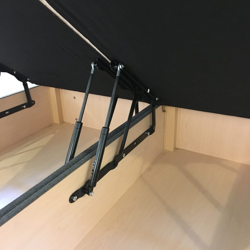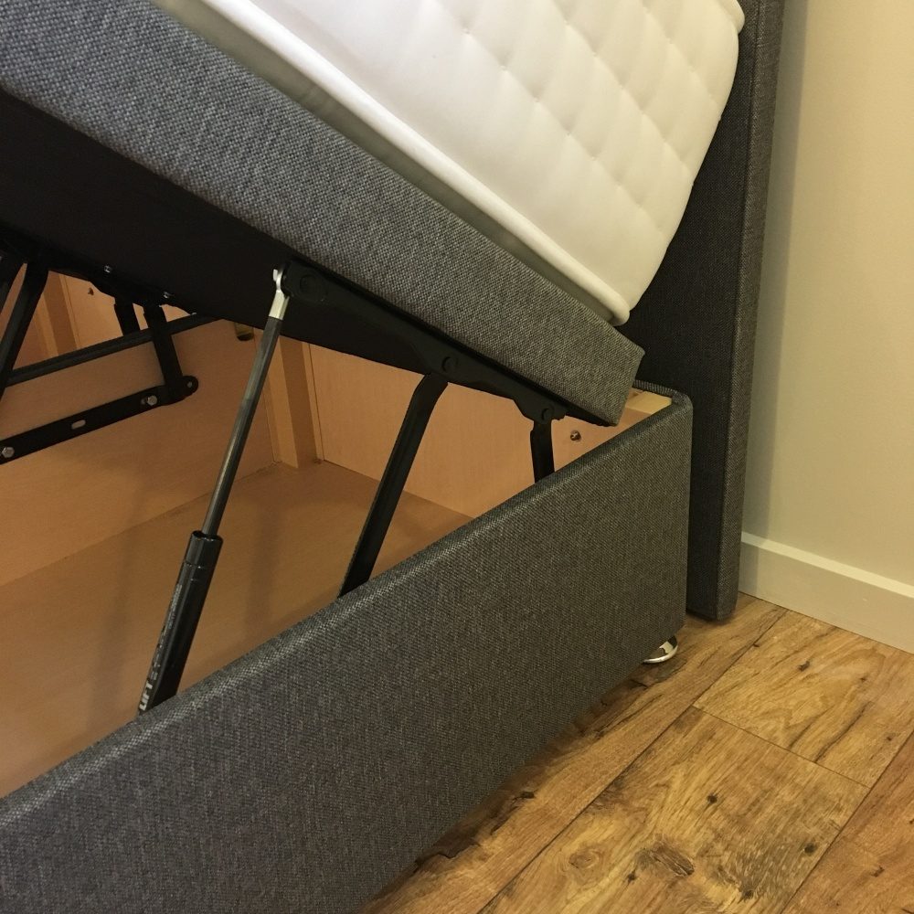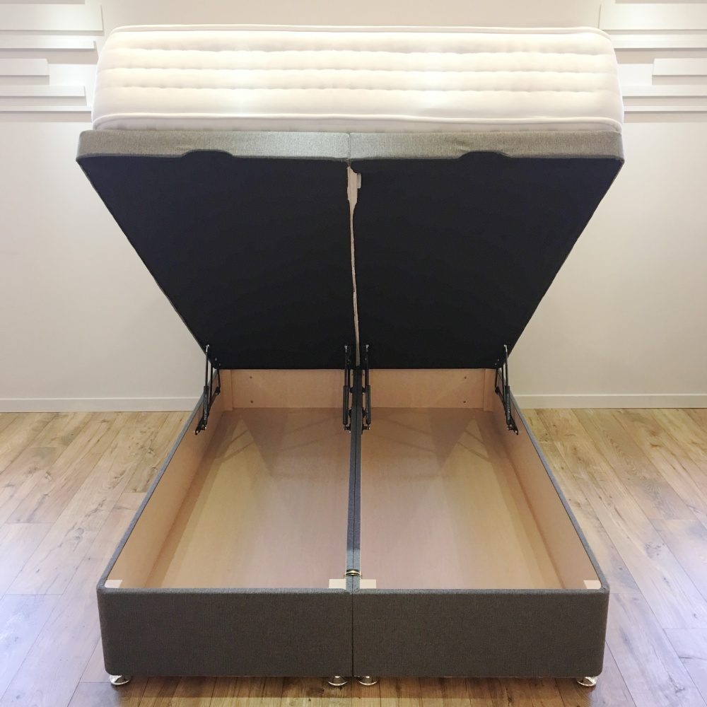 The base can be simply raised with the assistance of the gas lift hinges to reveal a large capacity storage area which is typically 3 times larger than a traditional divan. This model uses gas lift mechanism similar to what is used on a hatch back car, the advantage to this system is that it is much smoother and more controlled than the traditional spring mechanisms.